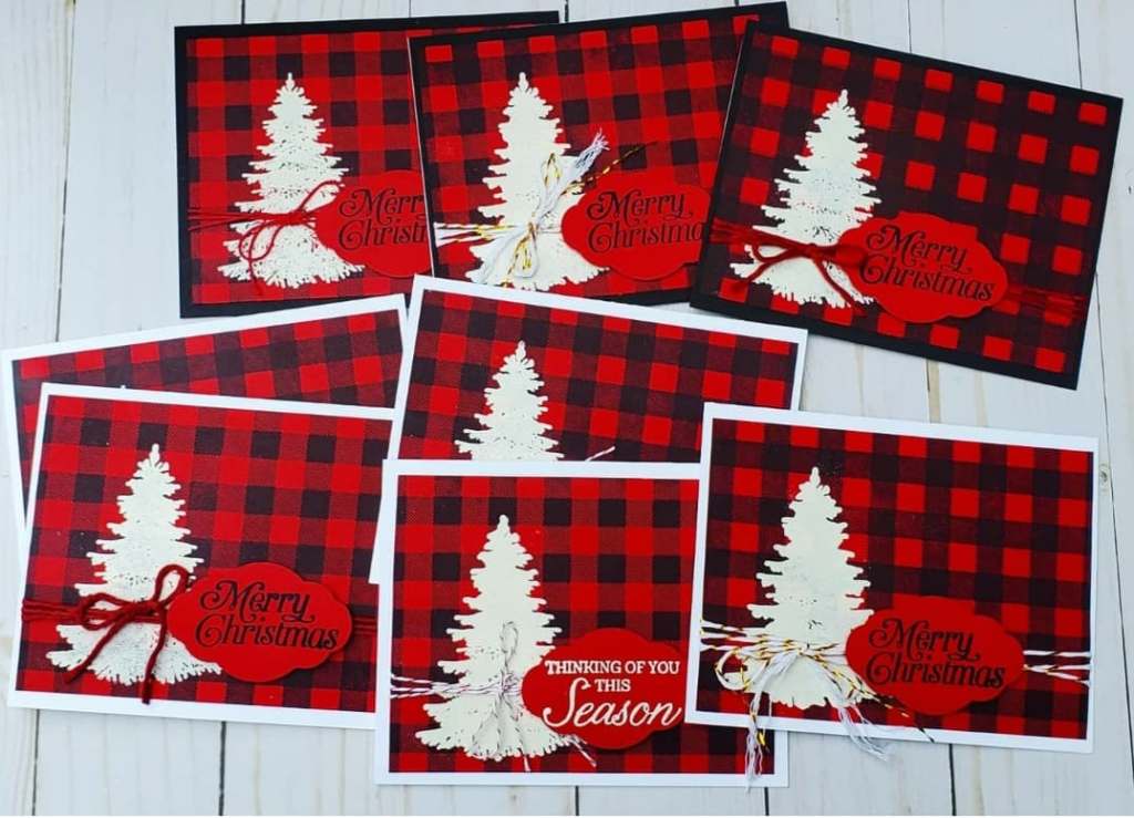 I just made some in mass production to get a stash for Christmas time. I used the Buffalo Check background stamp using black ink on Real Red cardstock. Then I heat embossed the tree image from Winter Woods stamp set in white embossing powder. I used a retired punch to punch out the different sentiments. Finally, I tied different baker’s twine around the card from my stash.